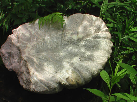 Comments: This stone has many different colors- green, brown, white, red, which makes it very special. I worked out leaf shapes and grain lines on both the top and bottom. The grain lines are made in it and not on it, so that they become a kind of gutters from which the rainwater can run off.