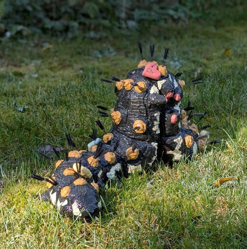 Notes: This colorful ceramic caterpillar is based on the caterpillar of the Red Admiral butterfly. Caterpillars have 5 hearts, which I tied to its back to illustrate. It also has 42 breathing openings with sensory bristles, which I depicted with the small brush bristles.
