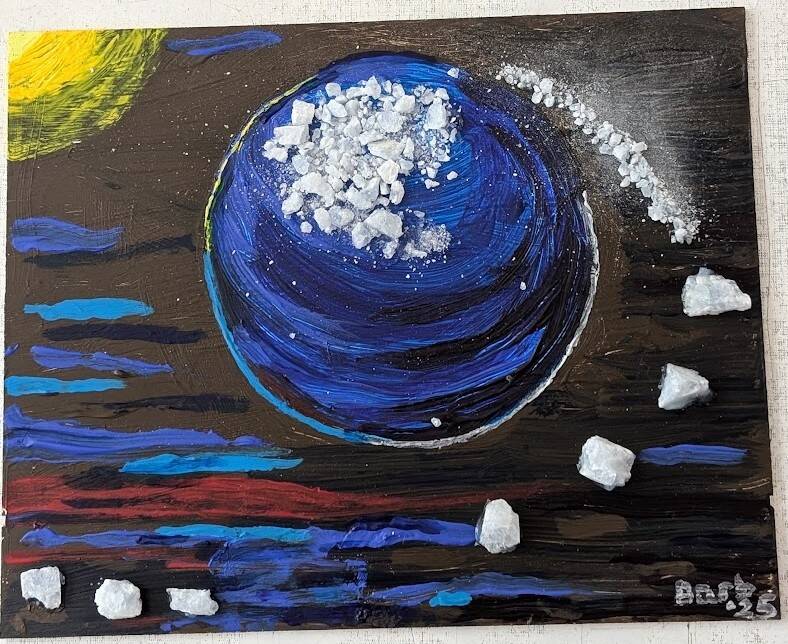 Materialen: Gemaakt met acrylverf op paneel en met steentjes en stof van lichtblauw Namibisch hardsteen marmer.