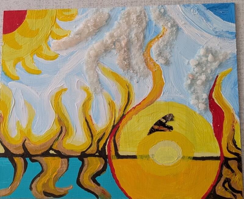 Materialen: Gemaakt met acrylverf op paneeltje, met steentjes en stof van rozeoranje Portugees hardsteen marmer, oranje Turkse Seleniet + oranje Onyx en een deel van